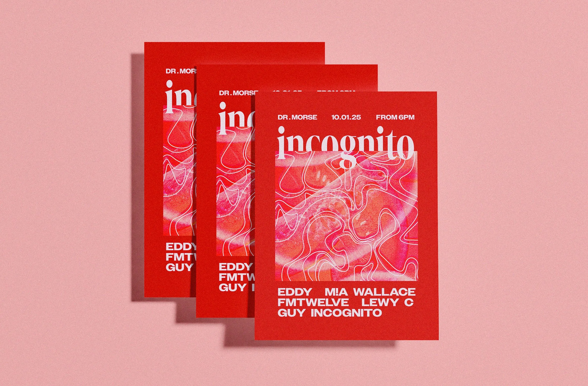 As the event Incognito aims to attract a local, respectful and like minded crowd, its details are displayed quietly across all creative. Hinting at the name, Incognito.
